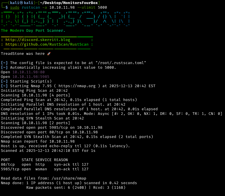Let’s start by identifying which network ports are open using rustscan: